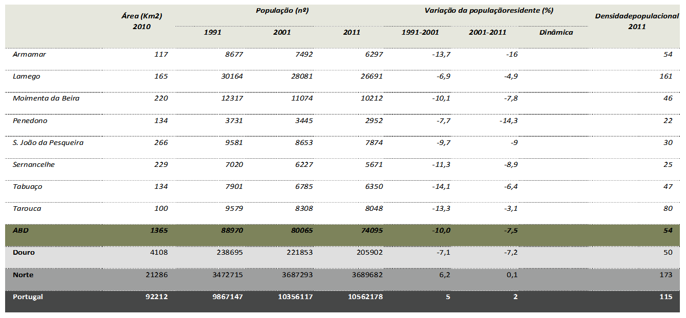 Ao longo dos últimos três momentos censitários os concelhos que integram a ABD registaram um perfil de retracção demográfica constante (– 10%, entre 1991 e 2001, e 7,5%, entre 2001 e 2011), em linha com a dinâmica registada na NUT III Douro (-10%, entre 1991 e 2001, e -7,5%, entre 2001 e 2011). Os concelhos onde esta quebra foi mais expressiva foram Armamar (-16%), Penedono (-14,3%) e São João da Pesqueira e Sernancelhe (-9%).
