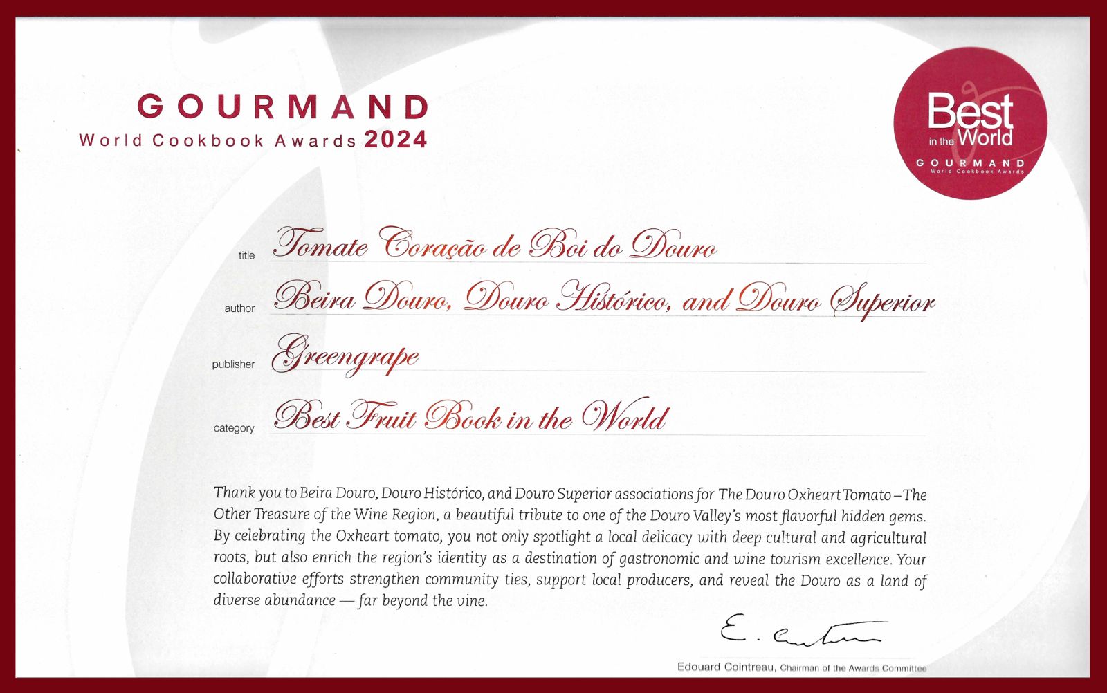 Tomate Coração de Boi do Douro – A outra riqueza do vale mágico foi eleito o melhor livro do ano no prestigiado Gourmand World Cookbook Awards, na categoria de livro sobre frutos. O anúncio foi feito durante o Cascais World Food Summit, que decorreu entre 18 e 21 de junho no Centro de Congressos do Estoril.