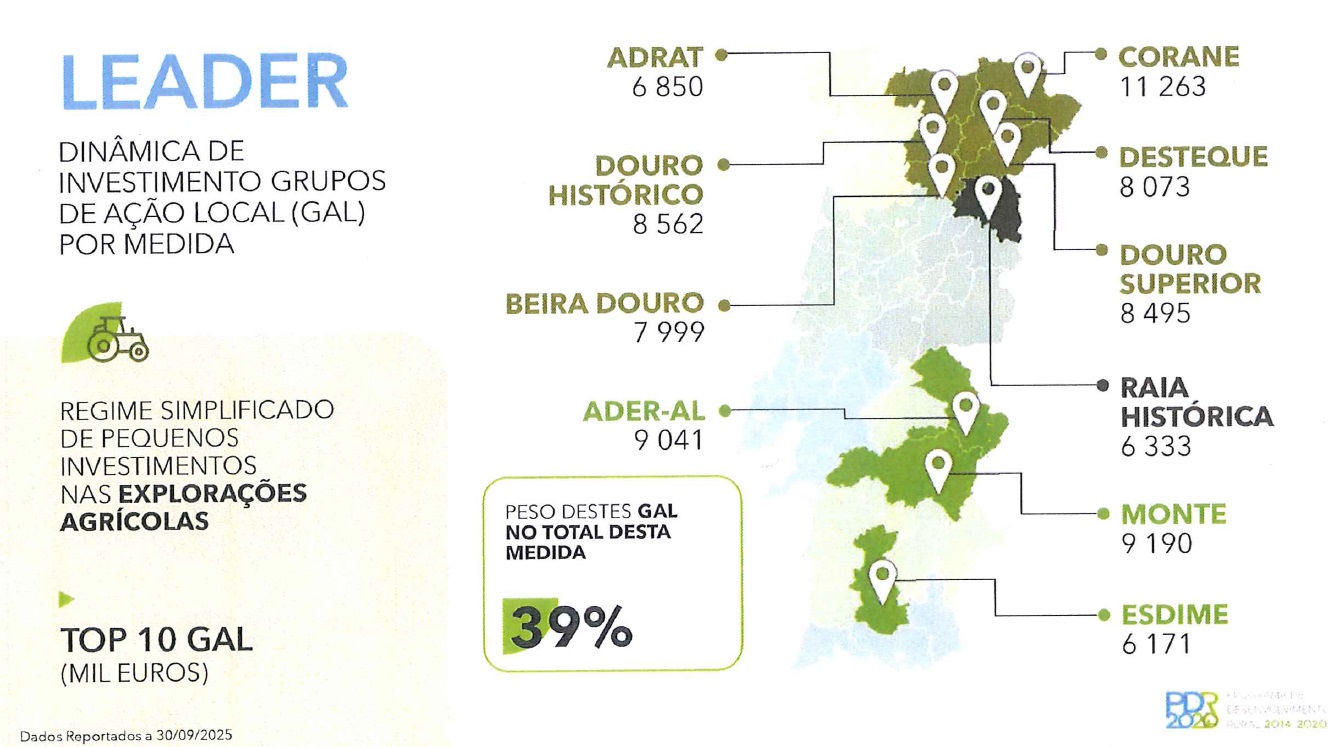 De entre as várias medidas apresentadas, destaca-se a medida 10.2.1.1 – Pequenos investimentos na exploração agrícola. Aqui, a Beira Douro integra o grupo dos 10 Grupos de Ação Local que mais têm apoiado os seus territórios com um total de 7.999 mil euros. De referir que estes números ainda não refletem os valores finais de execução, uma vez que o fecho do programa só deverá ocorrer a 31 de dezembro de 2025